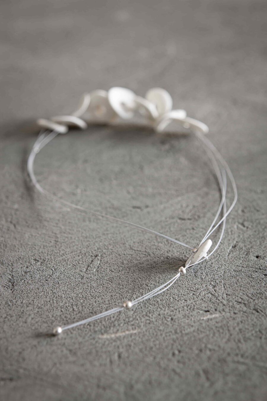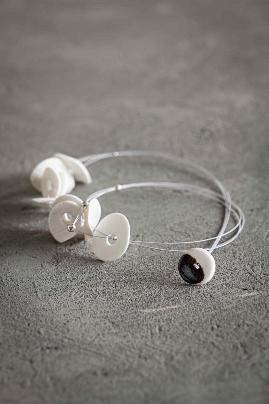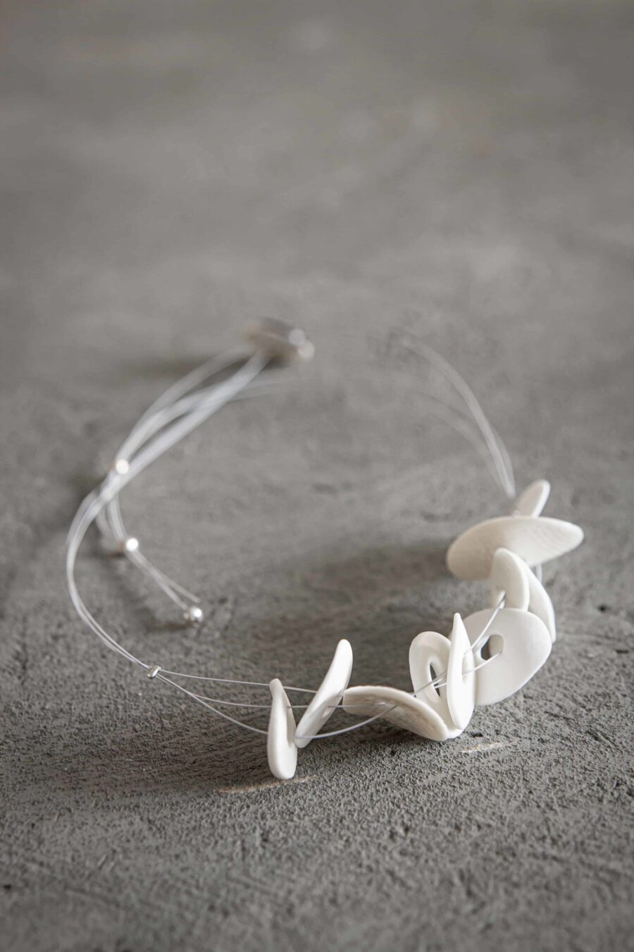 Collana corta con anellini in porcellana bianca cotta a 1250 gradi.