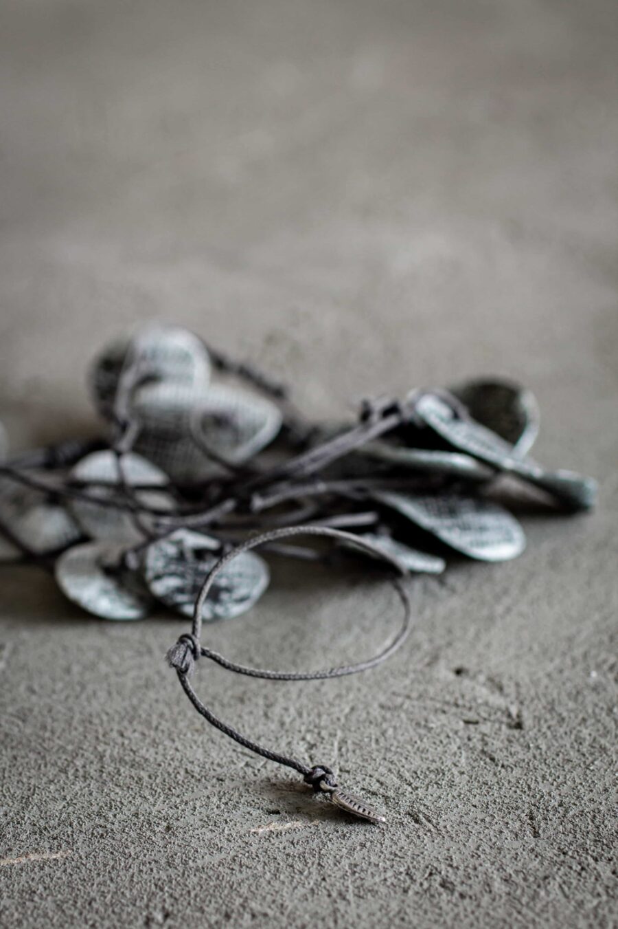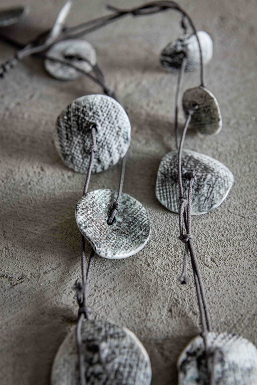 Collana lunga con petali in porcellana decorati in grigio e nero.